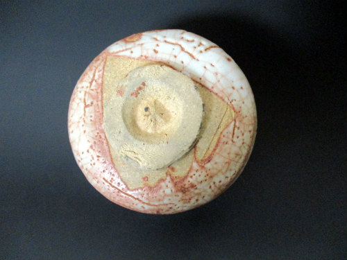 端正でナチュラルな造形ながら、深みを帯びた火色に白釉と大小の貫入のコラボ、大胆な月の絵が合わさって華やかな印象も受ける見ていて飽きのこない志野茶碗です。